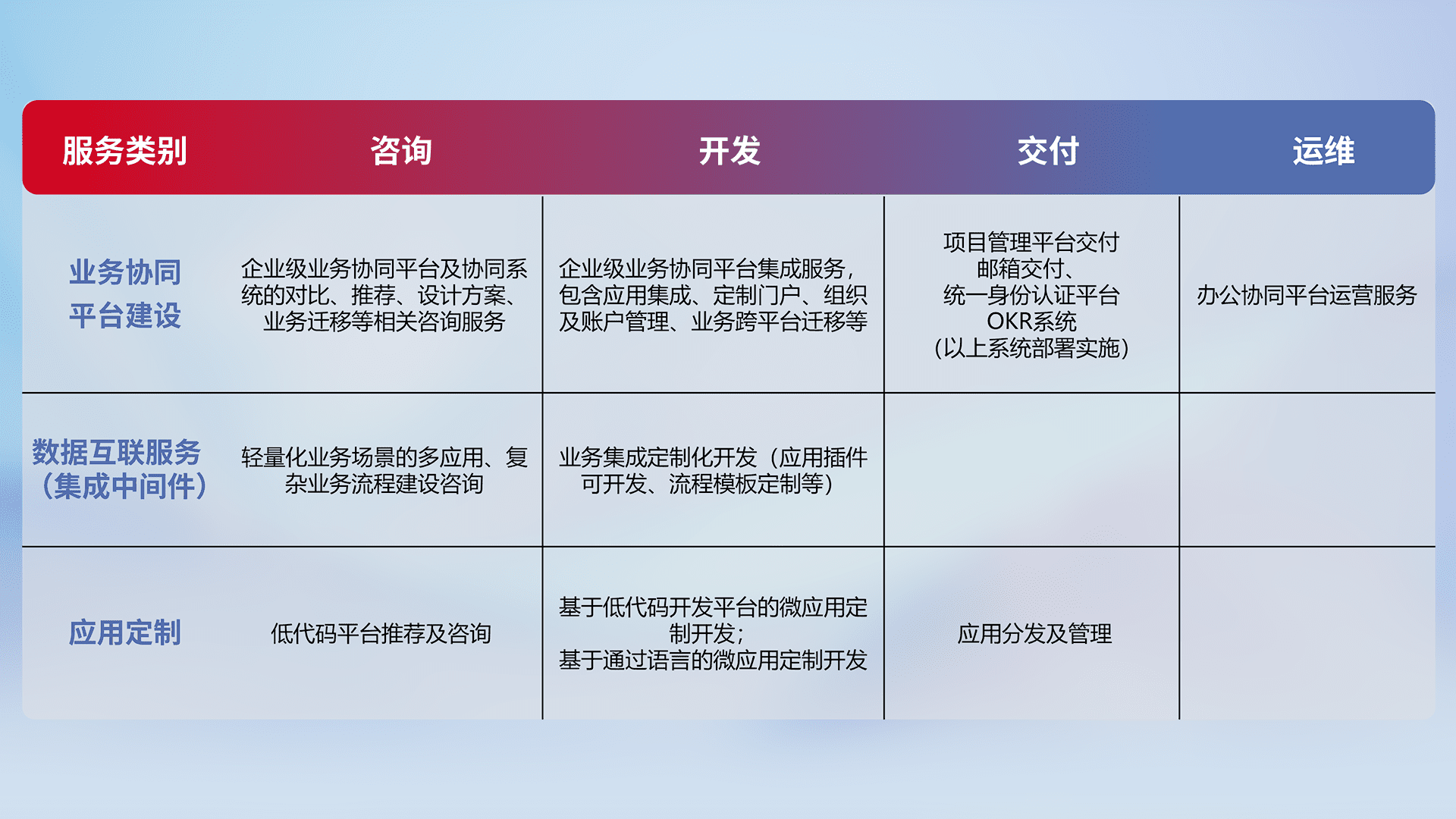 针对钉钉、、、企微、、、、IDaas等平台级产品提供产品的规划、、、、方案、、、、交付、、定制化开发等服务,,实现如统一协同办公、、智能客户服务、、、、混合会议管理、、、、智能数据查询、、、、等业务场景,,,,实现数字化转型。。。